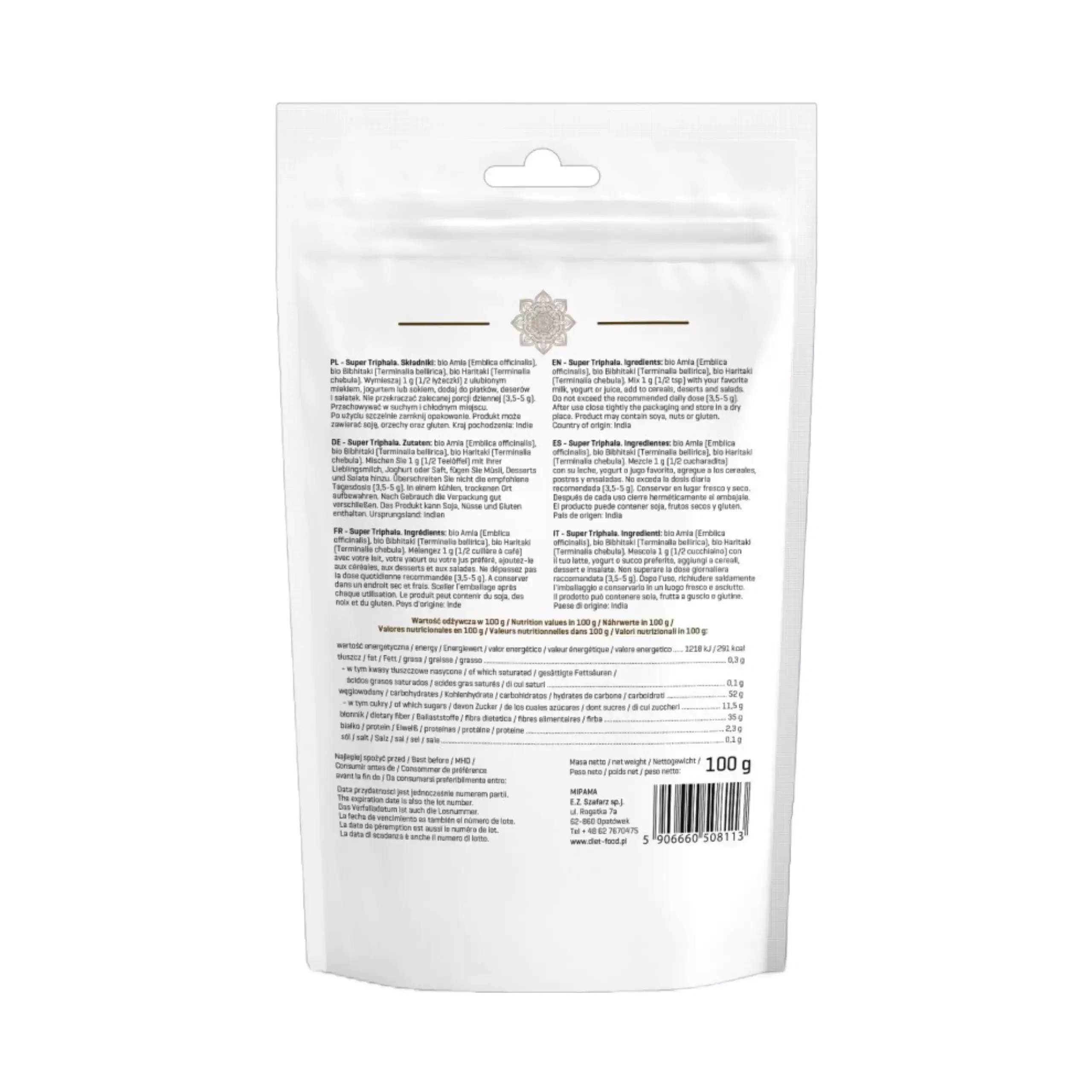 Triphala była stosowana w tradycyjnej medycynie ajurwedyjskiej od czasów starożytnych jako wielofunkcyjne leczenie objawów, od dolegliwości żołądka po próchnicę zębów. Uważa się również, że promuje długowieczność i ogólny stan zdrowia. Uważa się, że jest lekiem wieloziołowym, co oznacza, że zawiera kilka różnych ziół leczniczych. Preparaty ziołowe są powszechnie stosowane w medycynie ajurwedyjskiej, tradycyjnym systemie, który kładzie nacisk na profilaktykę chorób i promocję zdrowia. Uważa się, że połączenie synergicznych ziół zapewnia dodatkową skuteczność terapeutyczną i jest silniejszym leczeniem niż jakikolwiek pojedynczy składnik stosowany samodzielnie. Triphala to mieszanka suszonych owoców trzech następujących roślin pochodzących z Indii: Bio Amla (Emblica officinalis) Amla, bardziej znana jako agrest indyjski, odgrywa ważną rolę w medycynie ajurwedyjskiej. To jeden z najstarszych jadalnych owoców znanych w Indiach. Agrest indyjski to jadalny owoc małego lub średniego drzewa rosnącego w całych Indiach. Jagody mają kwaśny, ostry smak i włóknistą konsystencję. Z tego powodu jagody są często marynowane, moczone w syropie cukrowym lub gotowane w naczyniach w celu zwiększenia ich smakowitości. Agrest indyjski i jego ekstrakt są stosowane w medycynie ajurwedyjskiej w leczeniu objawów, takich jak zaparcia, a także w profilaktyce raka. Agrest indyjski jest bardzo pożywny i bogaty w witaminę C, aminokwasy i minerały. Zawierają również silne związki roślinne, takie jak fenole, garbniki, kwas filembelowy, rutyna, kurkuminoidy i emblicol. Bio Bibhitaki (Terminalia bellirica) Terminalia bellirica to duże drzewo, które powszechnie rośnie w Azji Południowo-Wschodniej. W medycynie ajurwedyjskiej znane jako „Bibhitaki", gdzie owoce tego drzewa są stosowane w leczeniu powszechnych dolegliwości, takich jak infekcje bakteryjne i wirusowe. Bibhitaki zawiera garbniki, kwas elagowy, kwas galusowy, lignany i flawony, a także wiele innych silnych związków roślinnych, które są uważane za odpowiedzialne za jego właściwości lecznicze. Ten silny środek ziołowy ma wiele zastosowań i może pomóc w leczeniu wielu problemów zdrowotnych. Bibhitaki jest również powszechnie stosowany w medycynie ajurwedyjskiej w leczeniu cukrzycy i zaburzeń regulacji poziomu cukru we krwi. Dzieje się tak, ponieważ Bibhitaki jest bogaty w kwas galusowy i kwas elagowy, dwa fitochemikalia, które mają korzystny wpływ na poziom cukru we krwi, wrażliwość na insulinę i masę ciała. Bio Haritaki (Terminalia chebula) Terminalia chebula to drzewo lecznicze, które rośnie na całym Bliskim Wschodzie, w Indiach, Chinach i Tajlandii. Roślina ta znana jest w Ajurwedzie jako „Haritaki", gdzie mały, zielony owoc drzewa Terminalia chebula jest używany jako lek. Jest to jeden z głównych składników Triphala. Haritaki jest bardzo ceniony w Ajurwedzie i często nazywany jest „królem leków". Był stosowany od czasów starożytnych jako lekarstwo na wiele chorób, w tym choroby serca, astmę, wrzody i dolegliwości żołądkowe. Ponadto Haritaki jest powszechnie stosowany w medycynie ajurwedyjskiej w leczeniu problemów trawiennych, takich jak zaparcia.