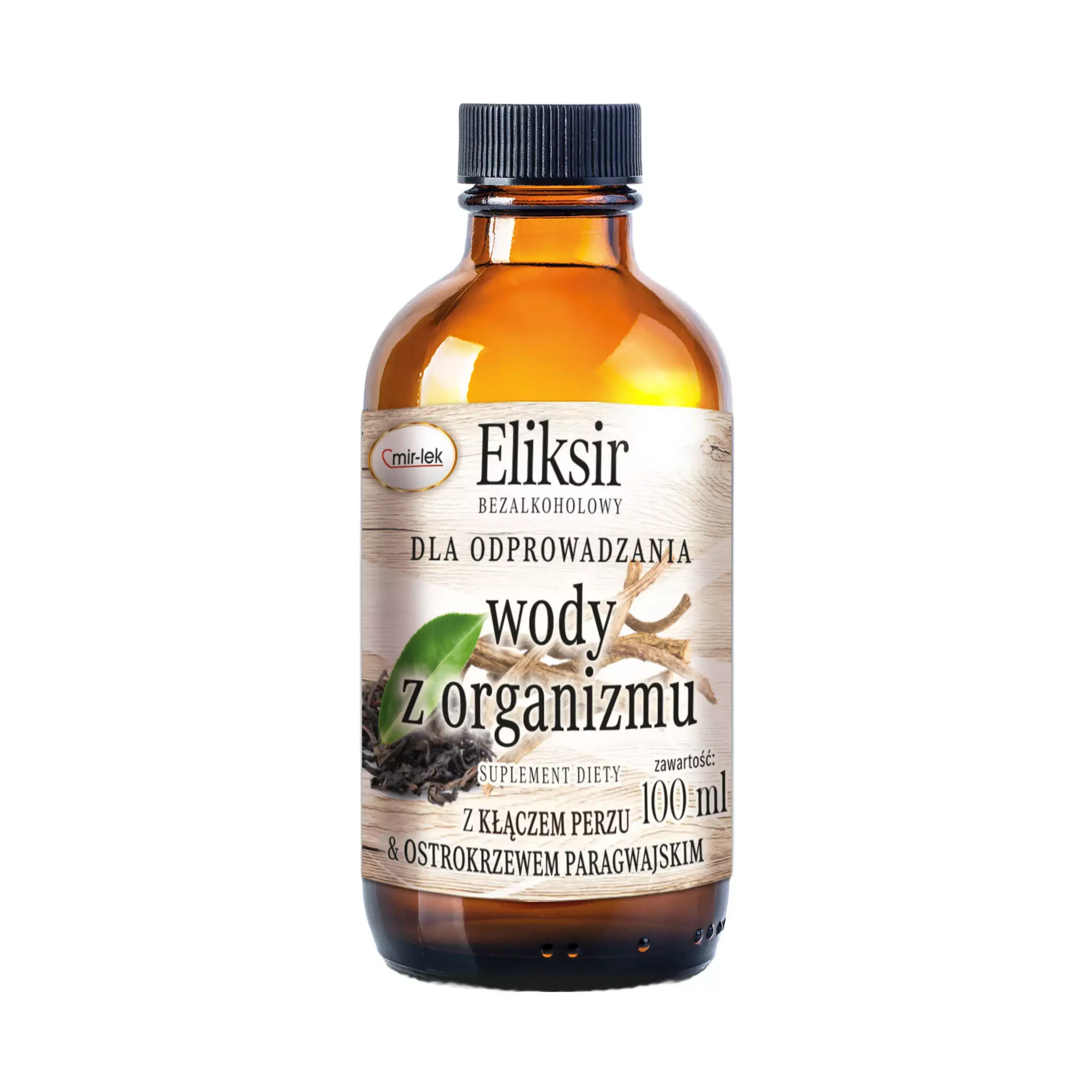 ELIKSIR dla wydalania wody z organizmu powstał z wyciągów z roślin takich jak: perz właściwy , cynamon , bez czarny , ostrokrzew paragwajski , karczoch zwyczajny , jałowiec pospolity , łuska gryki. Perz właściwy tradycyjnie stosowany w celu wspomagania funkcji wydalniczej nerek, i ułatwienia kontroli masy ciała, wspomaga prawidłowe funkcjonowanie układu moczowego, pobudza eliminację wody i toksyn, cynamon wspomaga układ moczowy, bez czarny pomaga w działaniach mających na celu kontrolę wagi, ostrokrzew paragwajski wspomaga odprowadzenie wody z organizmu, karczoch wspomaga metabolizm tłuszczy i węglowodanów.