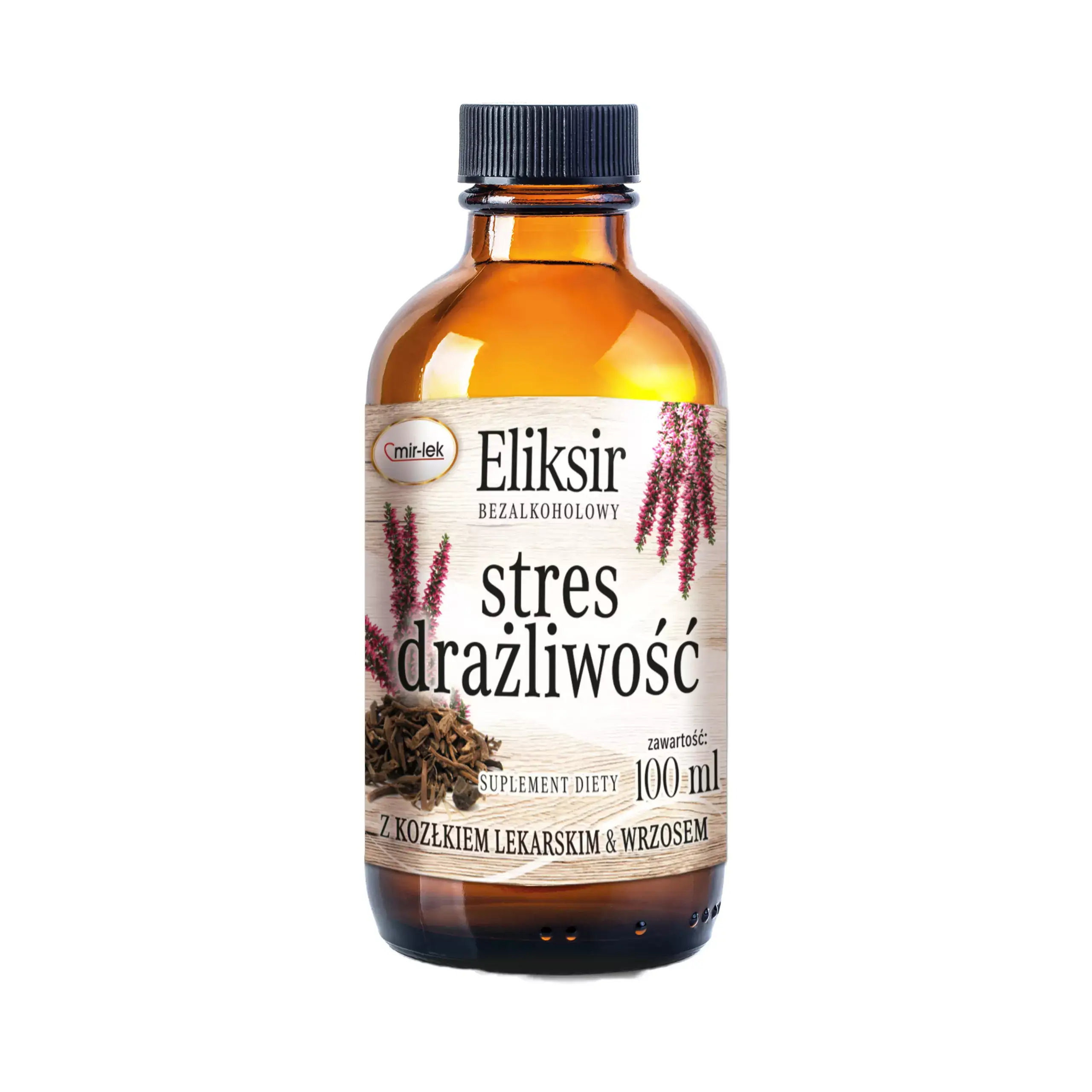 ELIKSIR przy stresie, drażliwości powstał z wyciągów z roślin takich jak: lukrecja, szyszka chmielu, kozłek lekarski, pierwiosnek, melisa, lawenda, wrzos, łuska gryki. Kozłek lekarski jest pomocny w okresach napięcia, stresu, drażliwości. Pomaga się odprężyć. Lukrecja wspiera system nerwowy, a chmiel oddziałuje na niego kojąco, pierwiosnek może pomagać w odzyskaniu naturalnego dobrego samopoczucia, pomaga się zrelaksować, melisa pomaga utrzymać dobry nastrój, przyczynia się do optymalnego wypoczynku, lawenda sprzyja relaksacji a wrzos pomaga odzyskać równowagę.