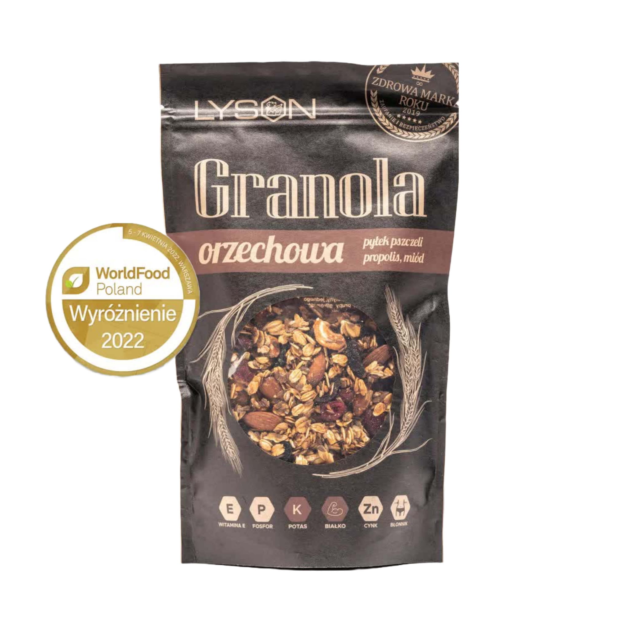 płatki OWSIANE, MIGDAŁY (12,3%), ORZECHY NERKOWCA (12,3%), siemię lniane, żurawina suszona: [żurawina, cukier, olej słonecznikowy], rodzynki: [rodzynki, olej słonecznikowy], ziarna słonecznika, miód gryczany (5,0%), miód wielokwiatowy (4,3%), pyłek pszczeli (1,8%), propolis (0,1%).