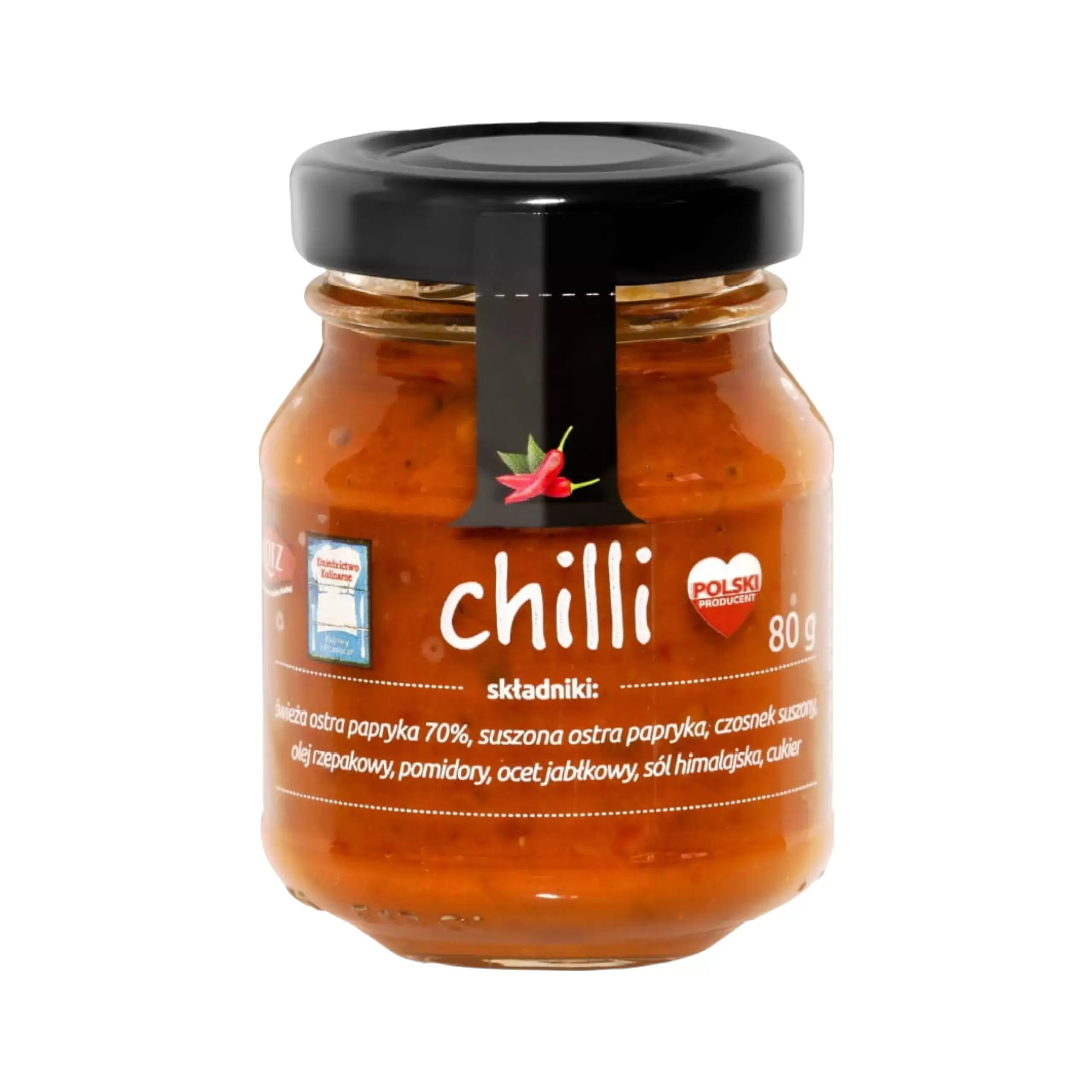 ŚWIEŻA OSTRA PAPRYKA 70%, SUSZONA OSTRA PAPRYKA, CZOSNEK SUSZONY, OLEJ RZEPAKOWY, POMIDORY, OCET JABŁKOWY, SÓL HIMALAJSKA, CUKIER.