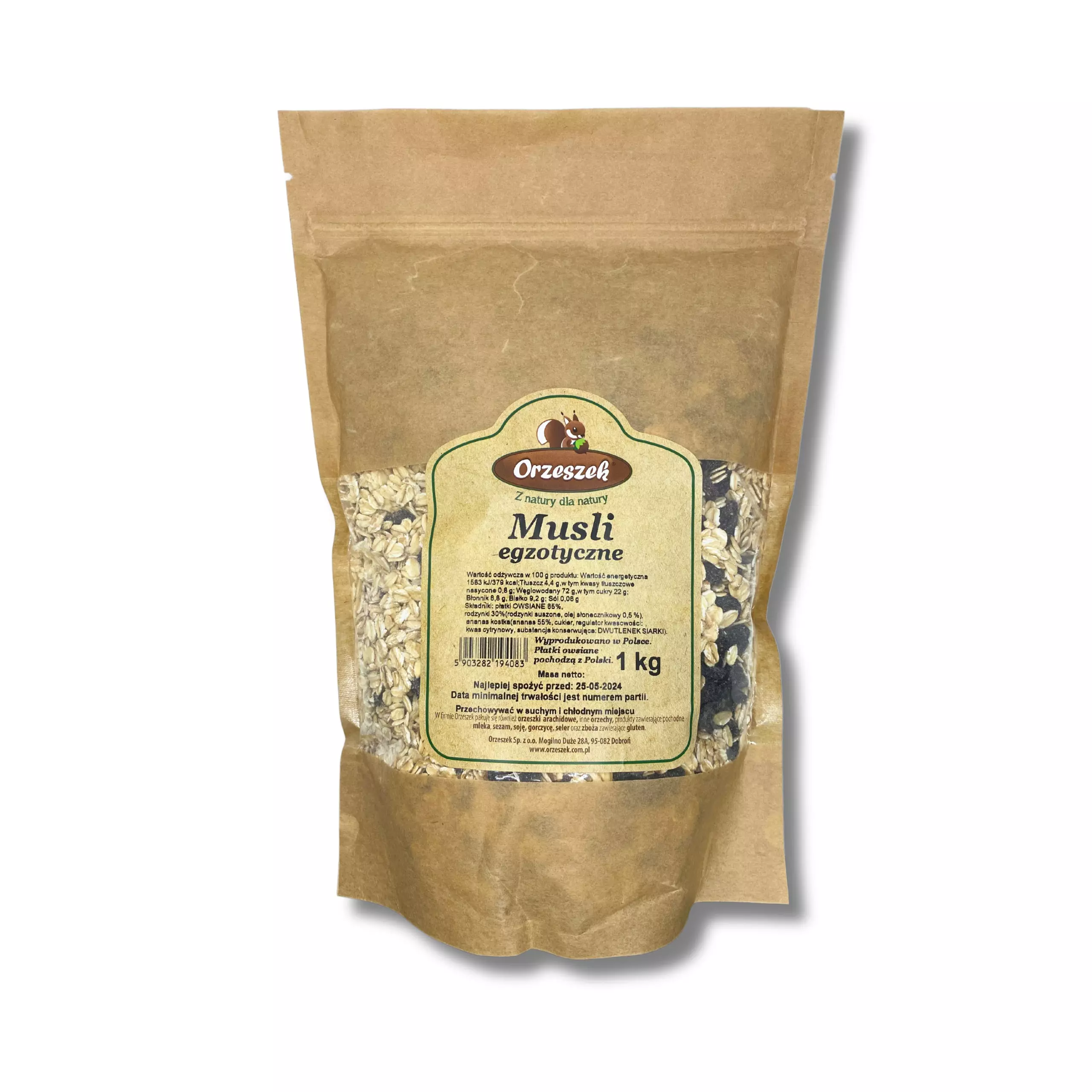 Płatki owsiane 65%, rodzynki 30% ( rodzynki suszone, olej słonecznikowy 1%, substancja konserwująca: Dwutlenek siarki), ananas kostka ( ananas 55%, cukier, regulator kwasowości: kwas cytrynowy, substancja konserwująca: Dwutlenek siarki)